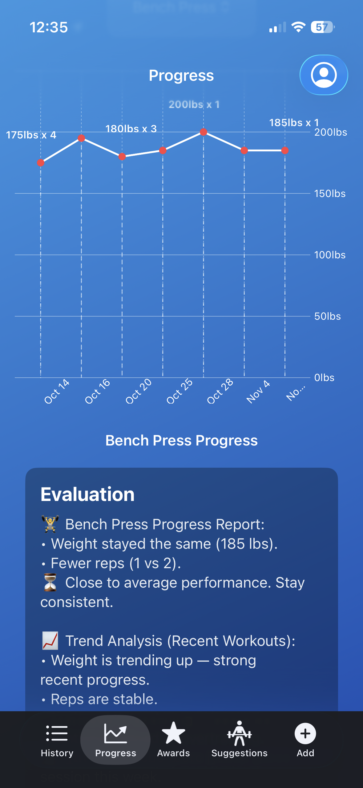 Currently, my app contains at least a rough draft version of all the main selling points I want to include. This includes a user login and creation system, workout log, visuals, and evaluation to provide feedback to the user, an awards system to add gameification, a recommendation page, and a user profile to easily track workout personal records of bench, squat, and deadlift. Within these pages, there are definitely more things that I want to develop and add on, but I am really happy with the progress right now.