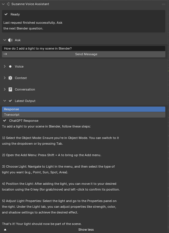 The first task-based experiment tests Suzanne’s most basic instructional path: whether a user can ask a simple Blender question inside the add-on and receive a correct, readable, and immediately actionable response without leaving the interface. For this trial, the prompt entered into Suzanne was, “How do I add a light to my scene in Blender?” This is a suitable first test because lighting is a common beginner workflow, the expected procedure is easy to verify, and the task exercises the core text-query pipeline from prompt entry to visible response.