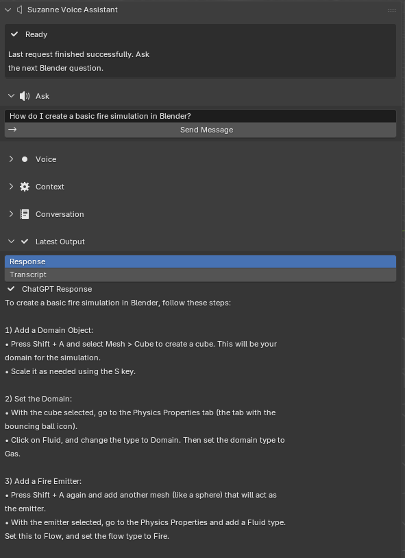 Suzanne returned a structured, ordered procedure that included creating a domain object, configuring the domain as a gas simulation, adding a separate emitter, setting the emitter as a fire flow source, baking the simulation, assigning a material, and adjusting render settings. This is the kind of longer procedural answer that Suzanne is intended to support: it keeps the user inside Blender while still presenting a workflow that would otherwise require searching across multiple external references.