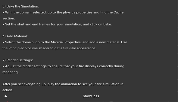 | Prompt | “How do I create a basic fire simulation in Blender?” |
