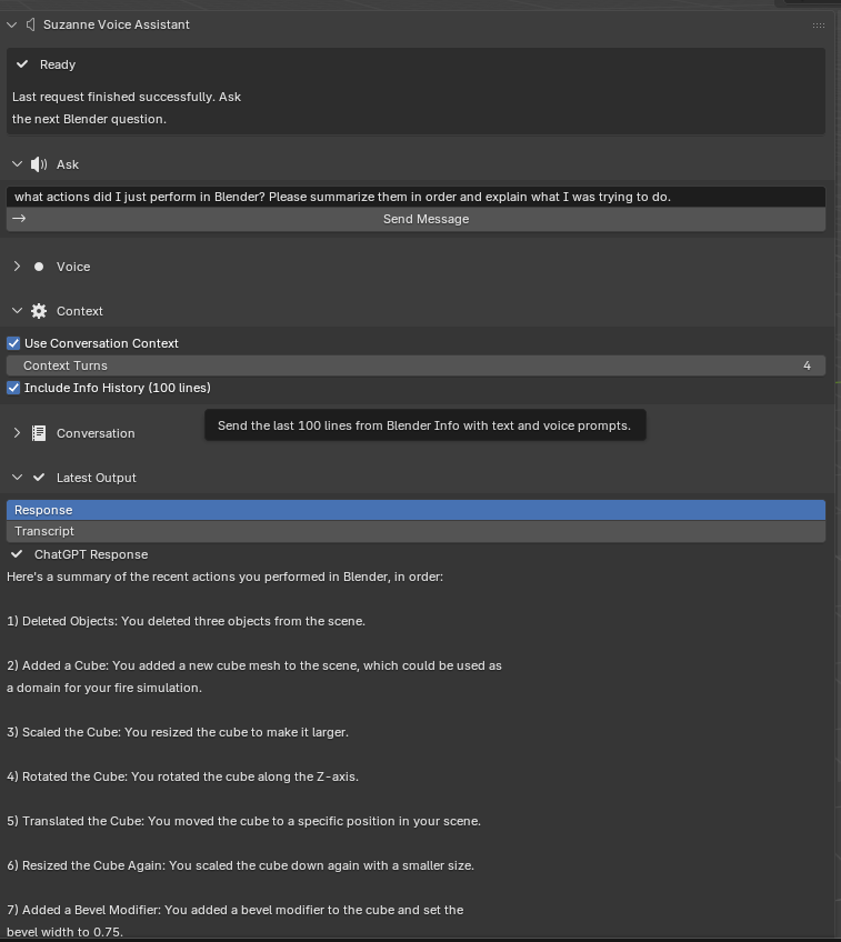 Methodologically, this experiment is especially relevant to the thesis because it addresses one of the core limitations of many external help sources: they do not know what the user has just done. By contrast, Suzanne can incorporate Blender’s recent Info history and reflect it back into the conversation. In the captured session, conversation context was also enabled, so this example should be interpreted as evidence of context-aware assistance rather than as an isolated benchmark of Info-history retrieval alone. Even with that caveat, the response clearly tracks recent viewport activity in a way that ordinary static documentation cannot.