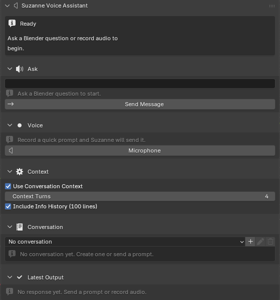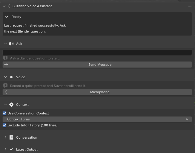 The implemented system shows that this design is technically viable. Suzanne now supports typed prompts, microphone-based prompt capture, local conversation memory, optional inclusion of recent Blender Info history, status-aware interface feedback, and a structured Latest Output review workflow. The Methods chapter demonstrated that these features are not just interface decoration; they are part of a reproducible interaction pipeline with clear validation, state transitions, and recovery behavior. In architectural terms, Suzanne successfully operationalizes the central thesis idea that AI guidance can be embedded directly into Blender without collapsing into hidden automation.